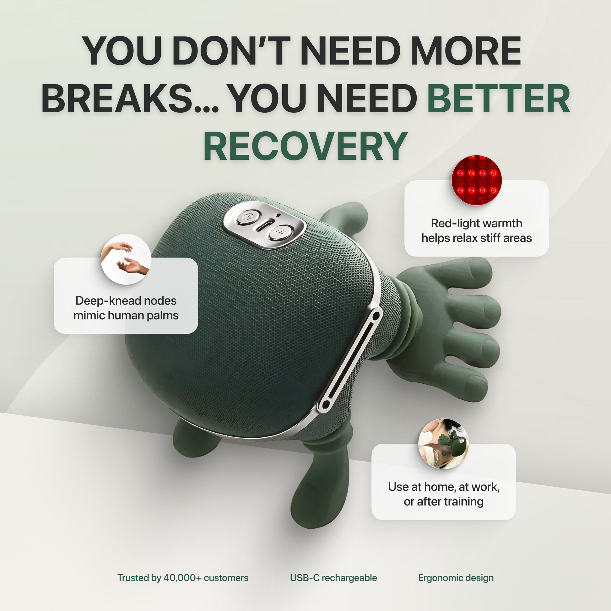 Soft 5-finger massage nodes gently hug your muscles and knead deeply.
